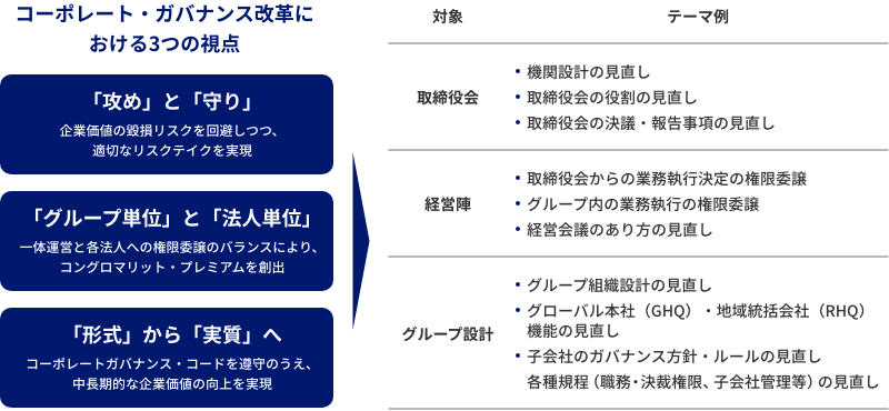 近年、ひとつの不祥事が経営に致命的な影響を与えるケースも増えており、コーポレート・ガバナンスの重要性は年々高まっています。法令遵守や情報開示への対応といった守りの側面もさることながら、投資家からの信頼と期待を得て企業価値を追求していくためには、より高い水準でコーポレート・ガバナンス体制を維持していくことが重要となります。NRIでは、取締役会の機能発揮などの中核的なテーマに加え、サステナビリティ経営やDXの推進など今後注目されるテーマから、クライアントのコーポレート・ガバナンス体制の改革を支援しています。
