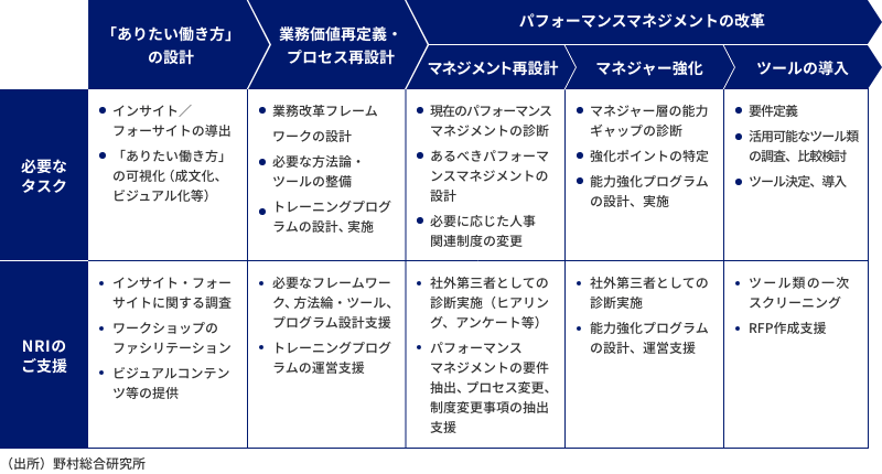 NRIは、画像・映像など感覚に訴えるツールを用いて「働き方ビジョン」のイメージを触発するとともに、それを用いた社員同士の対話の場の設計・運営により、改革の「自分ごと化」を実現します。また、パフォーマンスマネジメントプロセスを再設計するとともに、それを実行するためのマネジャー強化(スキル付与、意識変革)、ツール導入、制度改革を支援いたします。