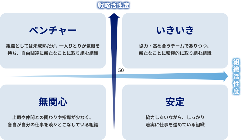 NRI組織風土診断は、職場に対する従業員の声(アンケート)に基づいて診断されます。診断では、組織の「成長・革新=戦略活性度」と「マネジメント・風通し=組織活性度」の2つの活性度を把握していきます。それらを弊社の「世の中のデータベース」と比較するかで、貴社がどのような「組織風土タイプ」であるのかを診断します。また、活性度には、さらに組織風土を表す19のアイテムがあり、組織の特徴をよりクリアに紡ぎ出します。