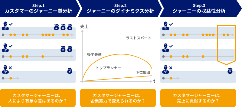 例えば、ある製造業のお客様への支援では、営業(収益性)とCX(絆づくり)の両面から顧客を評価する尺度を検討しました。過程の1歩目として、カスタマージャーニーと収益性の関係を分析し、取り組みの有効性を検証しました。