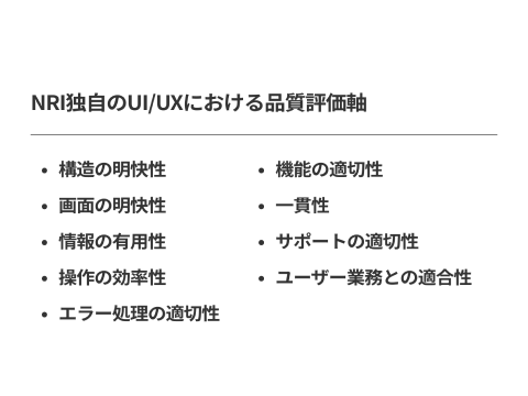 これまで培った実績からUI/UXの品質に関わるポイントや知見をNRI独自のUI/UX品質評価軸として体系化。