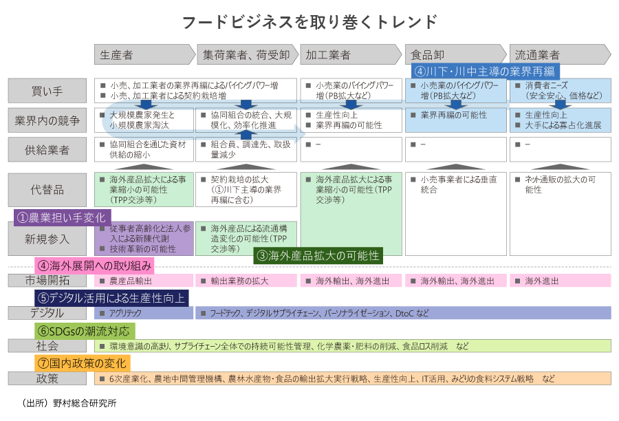 農業・食料関連産業は、人が生活をしていく上で最も基本となる産業の一つであり、長い歴史があります。結果として、過去に行われてきた事業活動や政策を経て、業界独特の仕組みや商習慣が存在しています。他方、人口減少や高齢化、さらにはライフスタイルの変化は加速度的に進んできているため、今まで以上のスピード感をもって業界の変革に取り組むことが求められています。 変革の方向性としては、デジタル技術の活用等による生産性の向上や海外進出による市場の拡大、さらにサプライチェーンの見直しや業界再編などが考えられます。