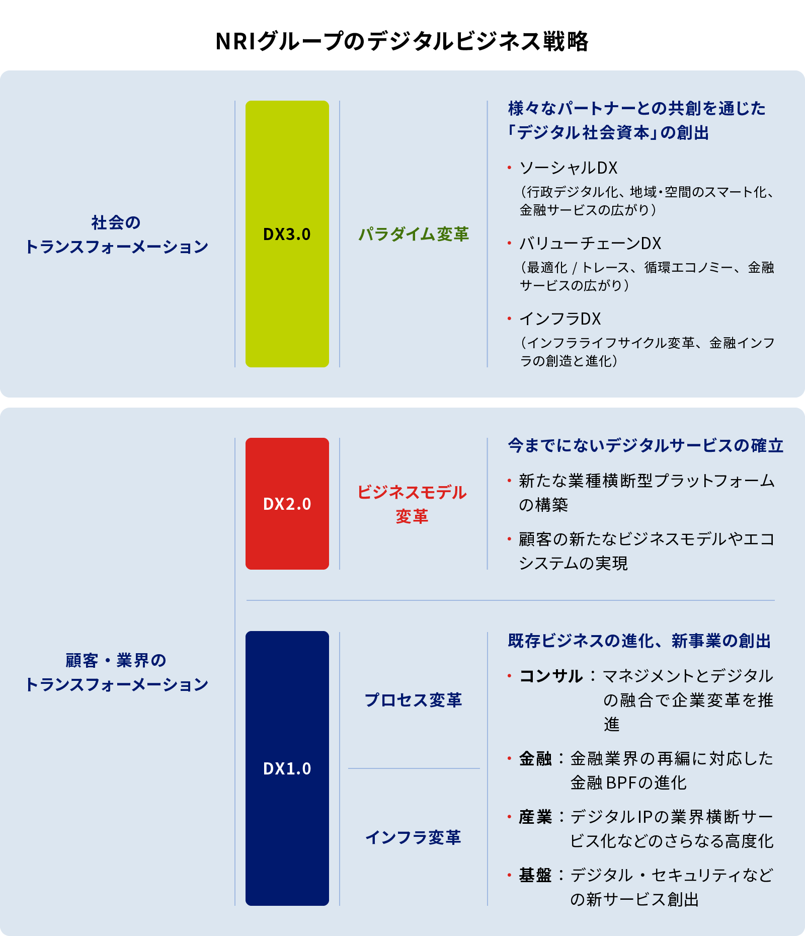 NRIグループでは、プロセス変革やインフラ変革を実現するDX1.0と、ビジネスモデル変革を実現するDX2.0 を展開してきました。これらは顧客企業や業界のトランスフォーメーションを目指すものです。そして、NRI グループはDXを通じて社会のパラダイム変革を行うDX3.0に挑戦します。これは社会そのもののトランスフォーメーションを目指すものです。
