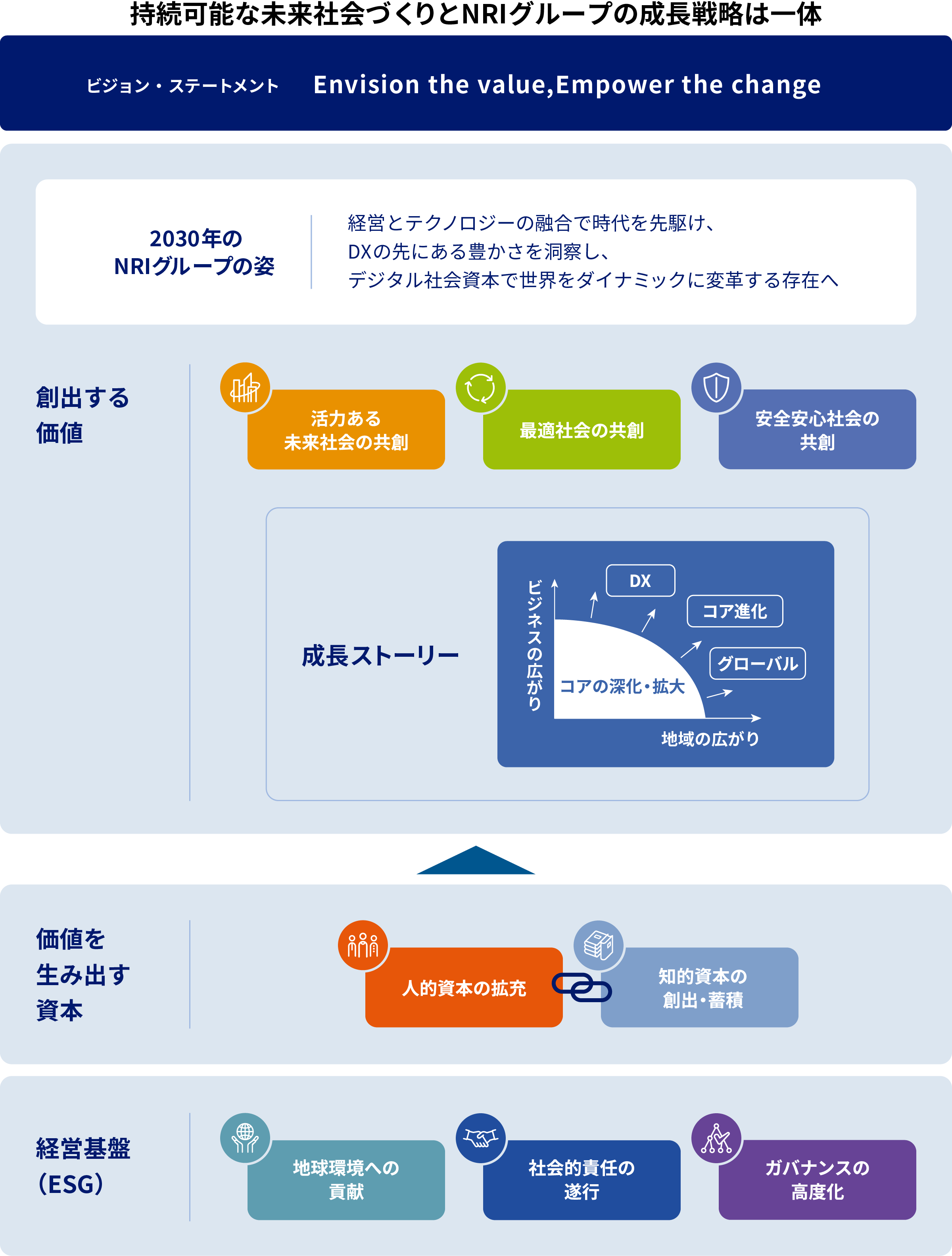 NRIグループのサステナビリティ経営は、「持続可能な未来社会づくりとNRIグループの成長戦略は一体」と考えています。