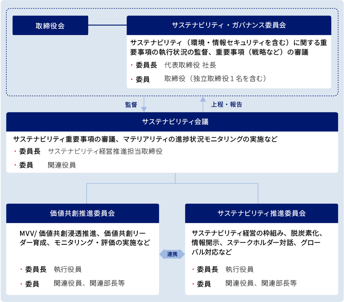 取締役会の監督のもと、取締役を委員長とする「サステナビリティ会議」がサステナビリティ重要事項の審議などを行い、定期的に取締役会へ報告を実施しています。