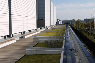地域との共生を目指し、東京第一データセンターは建物全体を傾斜地に埋め込むことにより景観を確保しつつ、外壁緑化や屋上緑化を推進しています。