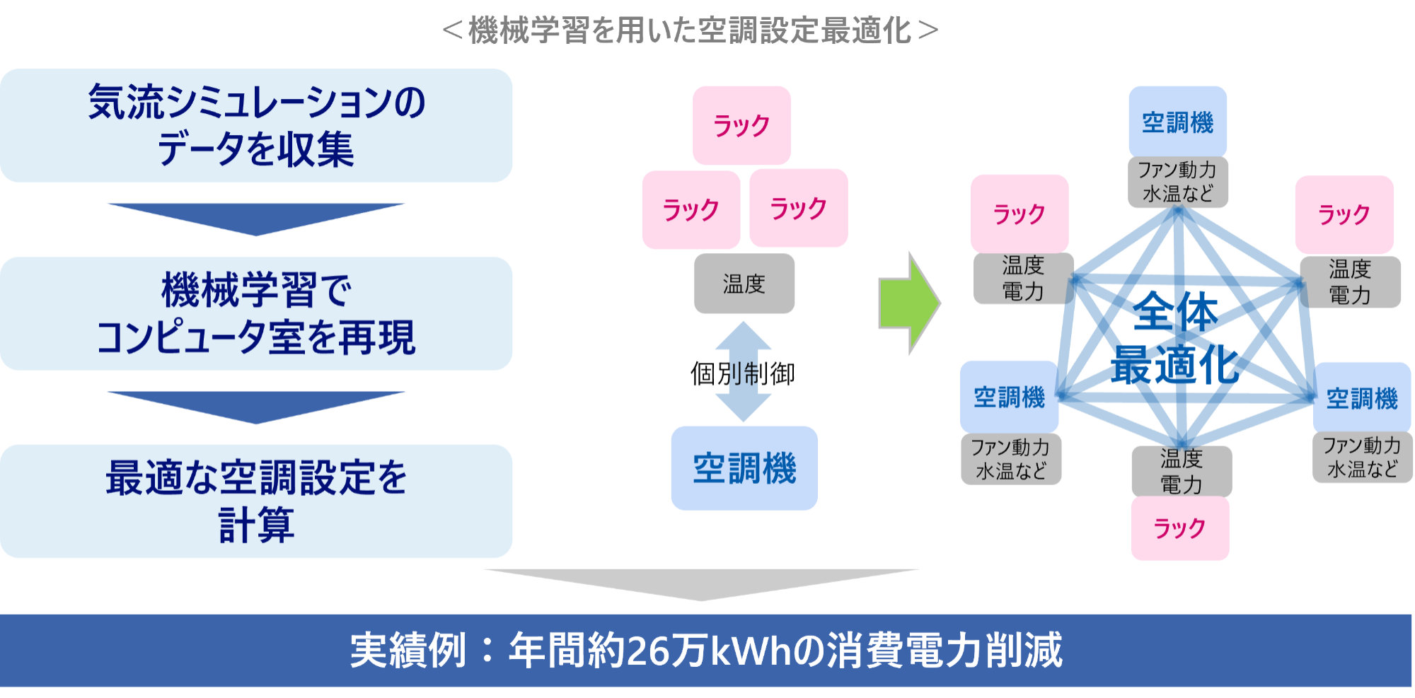 設備面での取り組みに加えて、運用面では、機械学習を用いた空調設定の最適化等に取り組んでいます。従来は個別に制御を行っていた空調機について、気流シミュレーションのデータを活用し、空調設定の全体最適化を図っています。