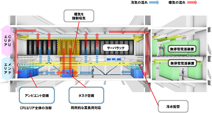 また、高温度部分に対して局所冷却を行うタスク空調とコンピュータ室全体を平均的に冷却するアンビエント空調を組み合わせることにより、空調の効率化を図っています。さらに、冷凍機や空調ユニットが接続された冷水循環システムに、冷水を蓄えることで空調負荷の平準化を図り、効率的な空調運転を可能にする一方で、高さを活かし効率的に送水できる「冷水縦型蓄熱槽」など、様々な省エネルギー設備を導入しています。