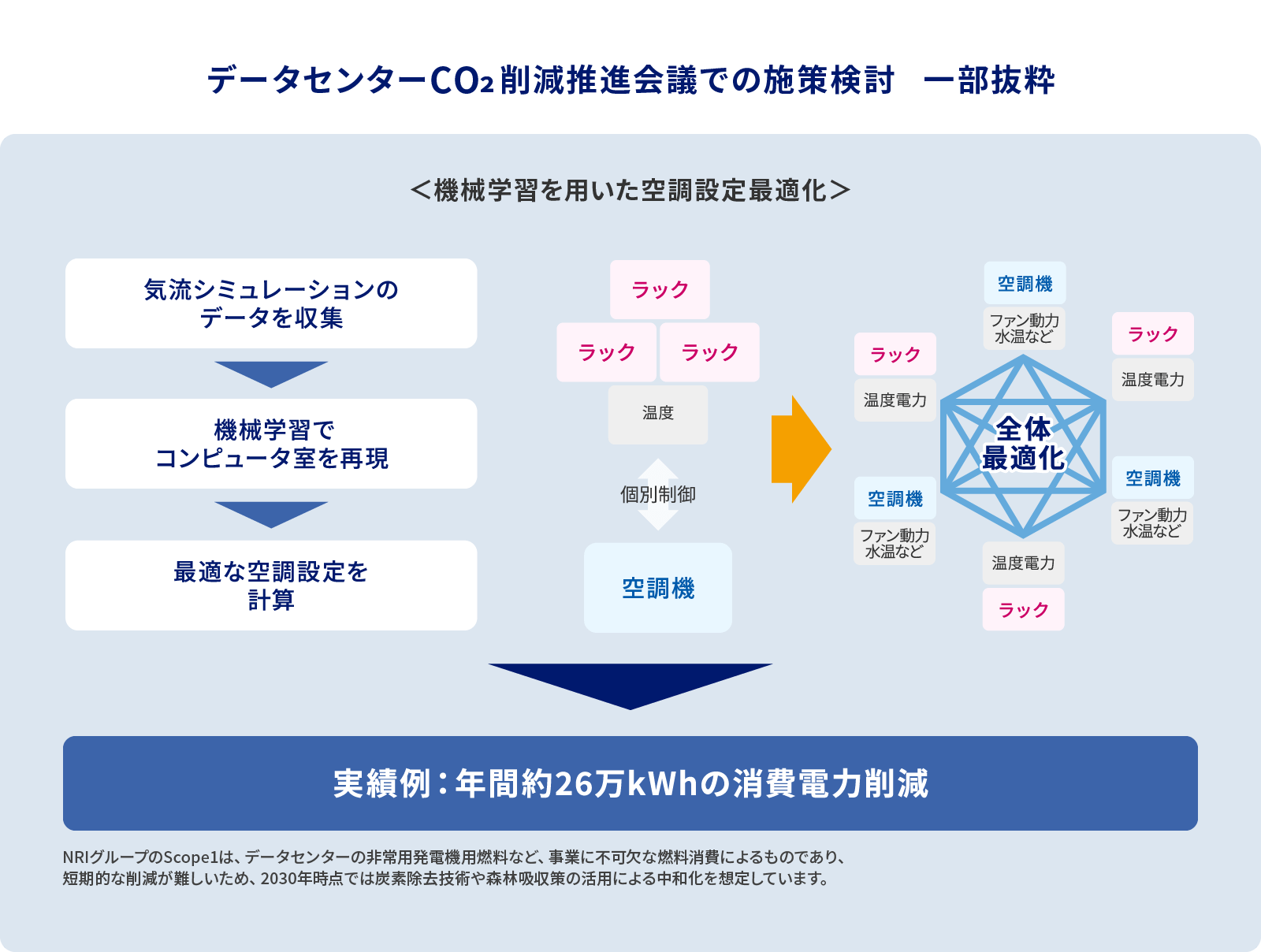 NRIグループが保有・運営するデータセンターでは、使用する電力の再生可能エネルギー化と、消費電力の削減の両面からアプローチをして、ネットゼロに向けた取り組みを進めています。