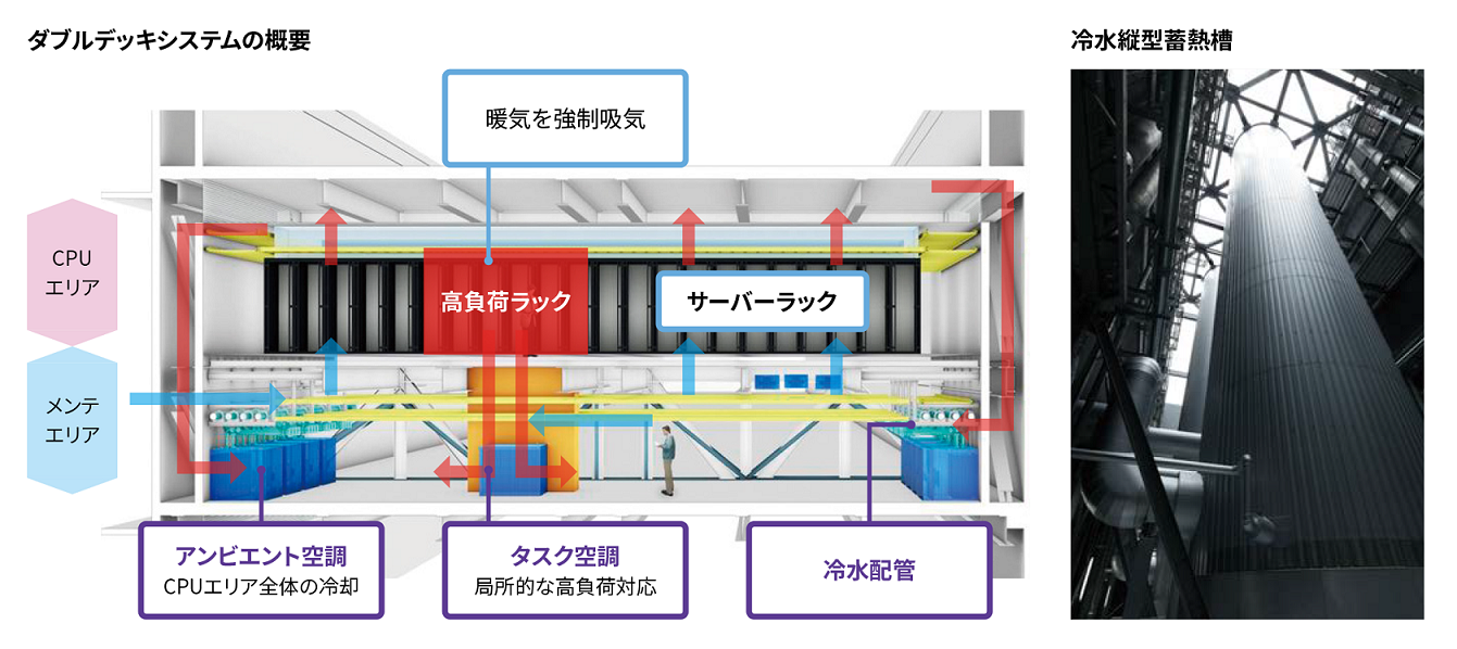 例えば、2012年11月に開業した東京第一データセンターでは、サーバ機器を置くフロアと空調などの設備関連機器を置くフロアを分 離して効率的かつ柔軟性の高い空調を実現する「ダブルデッキシステム」や、冷水を蓄積して効率的な空調を実現する「冷水縦型蓄 熱槽」等、様々な省エネルギー設備が導入されています。