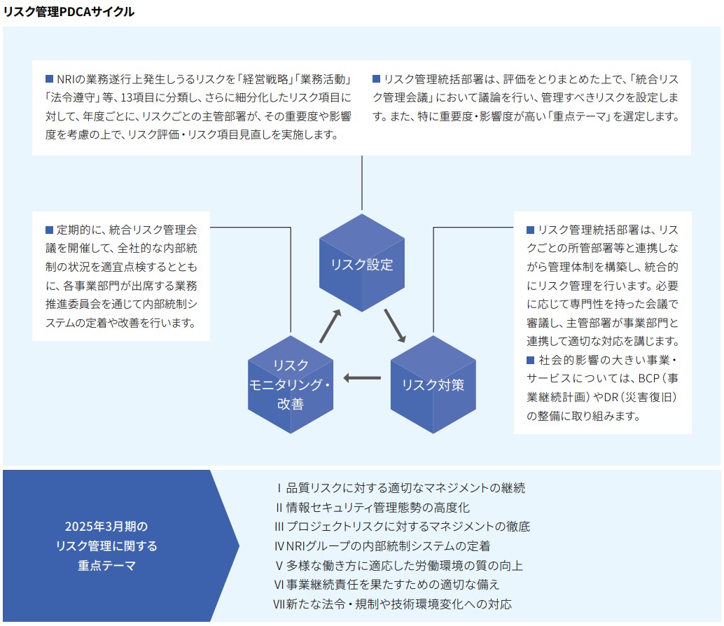 NRIグループ全般にわたって内部統制システムを整備し、かつ継続的な改善を図るため、リスク管理担当役員を任命するとともに、リスク管理統括部署を設置しています。 また、内部統制システムの構築に関する基本方針を定め、統合リスク管理会議を開催して全社的な内部統制の状況を適宜点検するとともに、各事業部門が出席する業務推進委員会を通じて内部統制システムの定着を図っています。