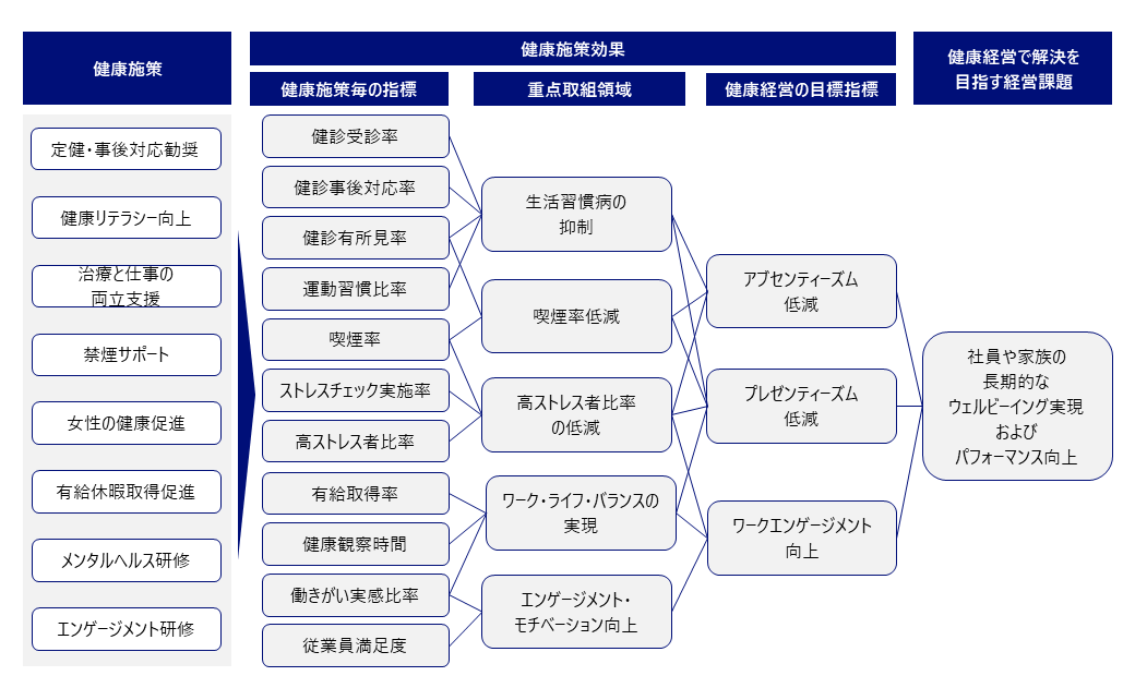さらに、これら健康経営の「経営課題」、「目標指標」、「重点取組領域」そして「個々の健康施策」はそれぞれの連関が「健康経営戦略マップ」により可視化されており、このマップは健康経営の推進サイクルにおける指針として活用されています。