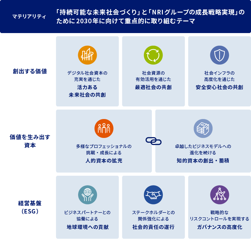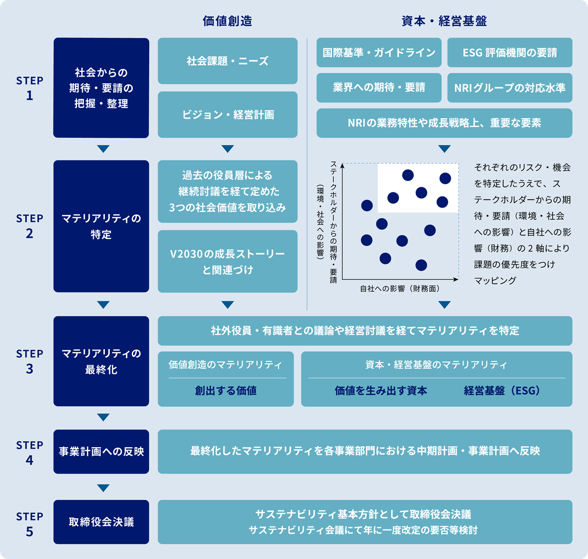 国際基準・ガイドライン、ESG評価機関からの要請、企業理念・成長戦略との整合、社外役員・有識者の意見等を参考に、経営の視点や社外ステークホルダーの視点からNRIグループのマテリアリティ(重要課題)を特定しています。2030年に向けた長期経営ビジョン「NRI Group Vision 2030」(V2030)策定時には、NRIグループにとっての影響(財務面)のみならずステークホルダーからの期待・要請(環境・社会への影響)を合わせたダブルマテリアリティの考え方等を考慮したマテリアリティを再度特定し、V2030に組み入れました。