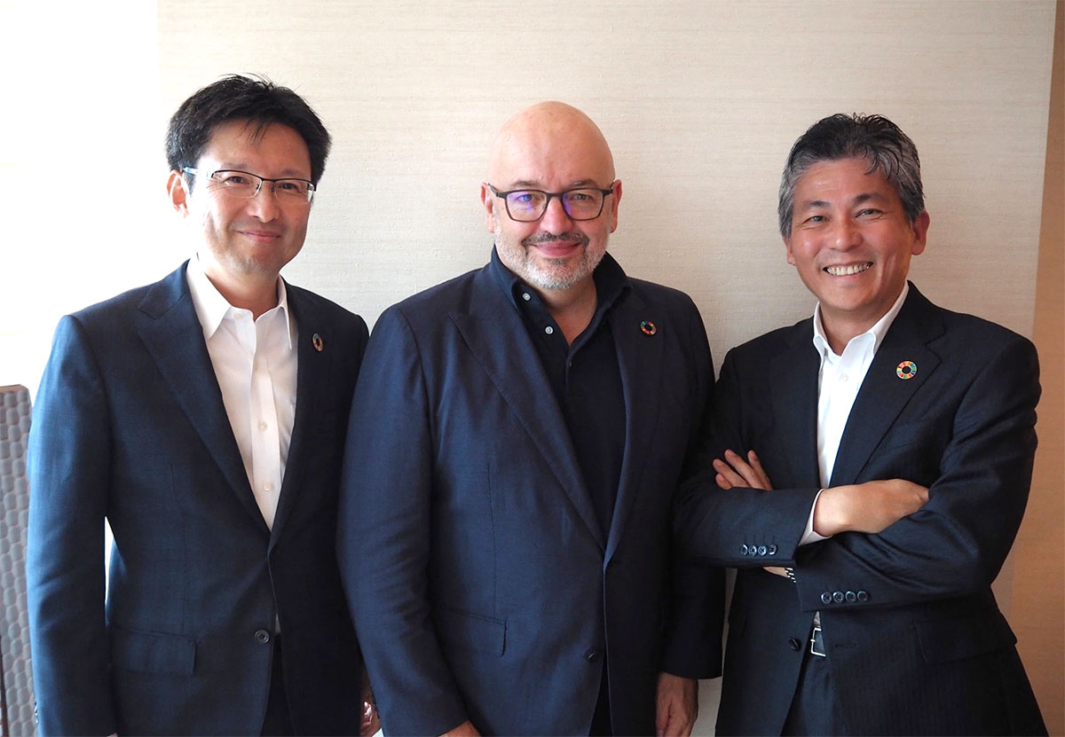 Bakker氏と、サステナビリティ推進担当役員の桧原、DX担当役員の野口が、DX3.0を通した社会課題解決プロセスや、企業と企業連合体(WBCSD)との連携について意見を交わしました。